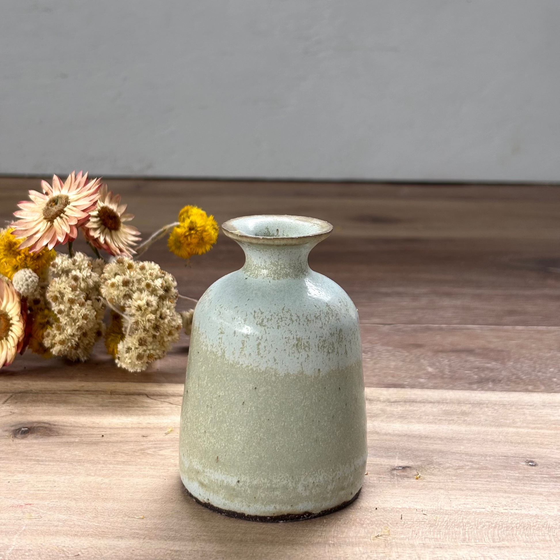 The dusty green ink pot vase was inspired by Victorian ink wells and made by hand on the potters wheel in my garden studio at Bells Beach Victoria. The vase shape given to the ink pot style is perfect for holding a small bouquet or a few hand picked flowers from the garden. We have vases in this style these dotted around our house with feathers and other found treasures.